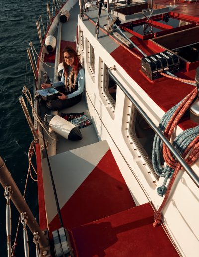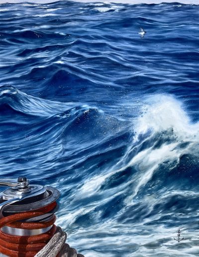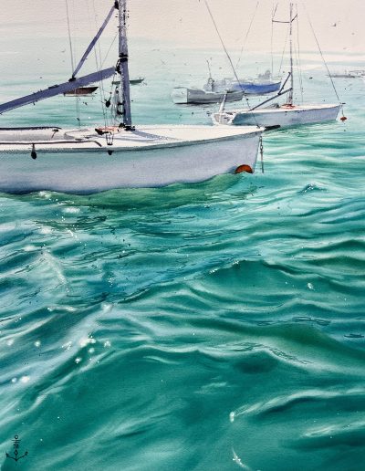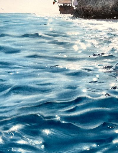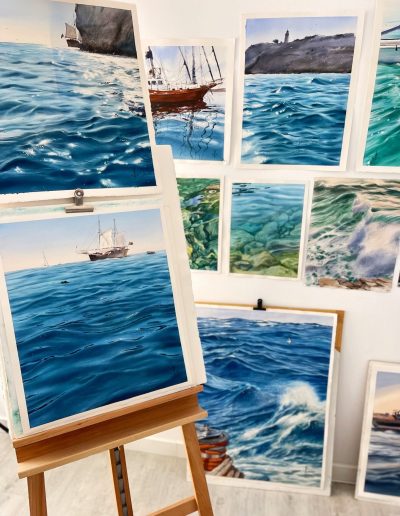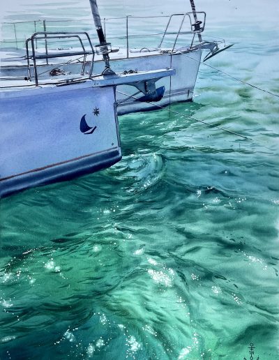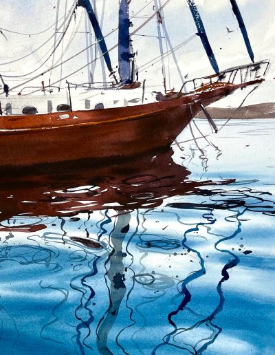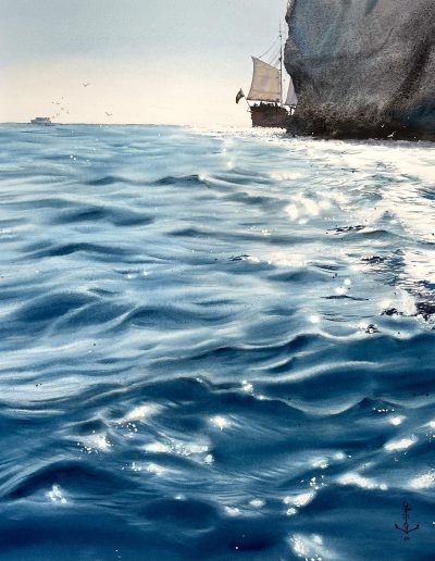 Since 2012, Julia has been working in the watercolour technique, melding classical methods with her own unique approach. Her inspiration stems from her travels to fishing villages and major port cities around the world. She has dedicated much of her work to capturing the play of light and colour on water surfaces, as well as the intricate details of ships, boats, and yachts. Her most famous series, “Islands in the Stream,” reflects her fascination with the sea and its environments. Now, residing in Portugal, she finds inspiration in the daily presence of the ocean, which continually reflects her work. Julia  actively promotes watercolour techniques through workshops and demonstrations around the world. Her life and work embody a passionate dedication to both art and the Sea, and her teachings reflect a journey of personal fulfillment, rooted in a lifelong love of the Ocean and a commitment to sharing the beauty of watercolour with the world.