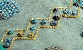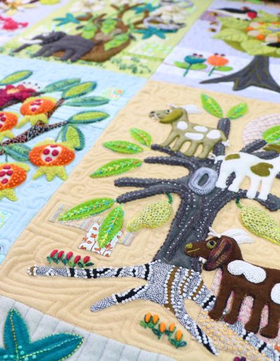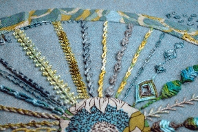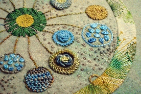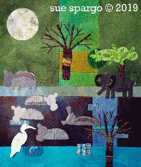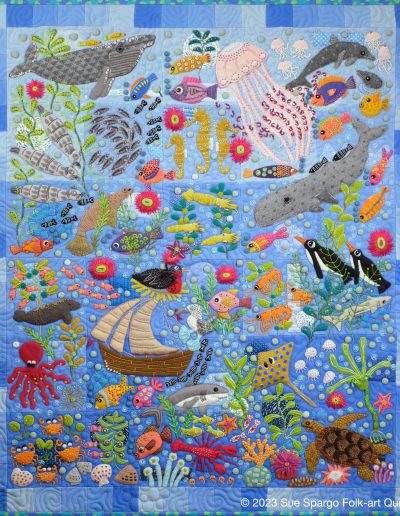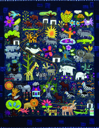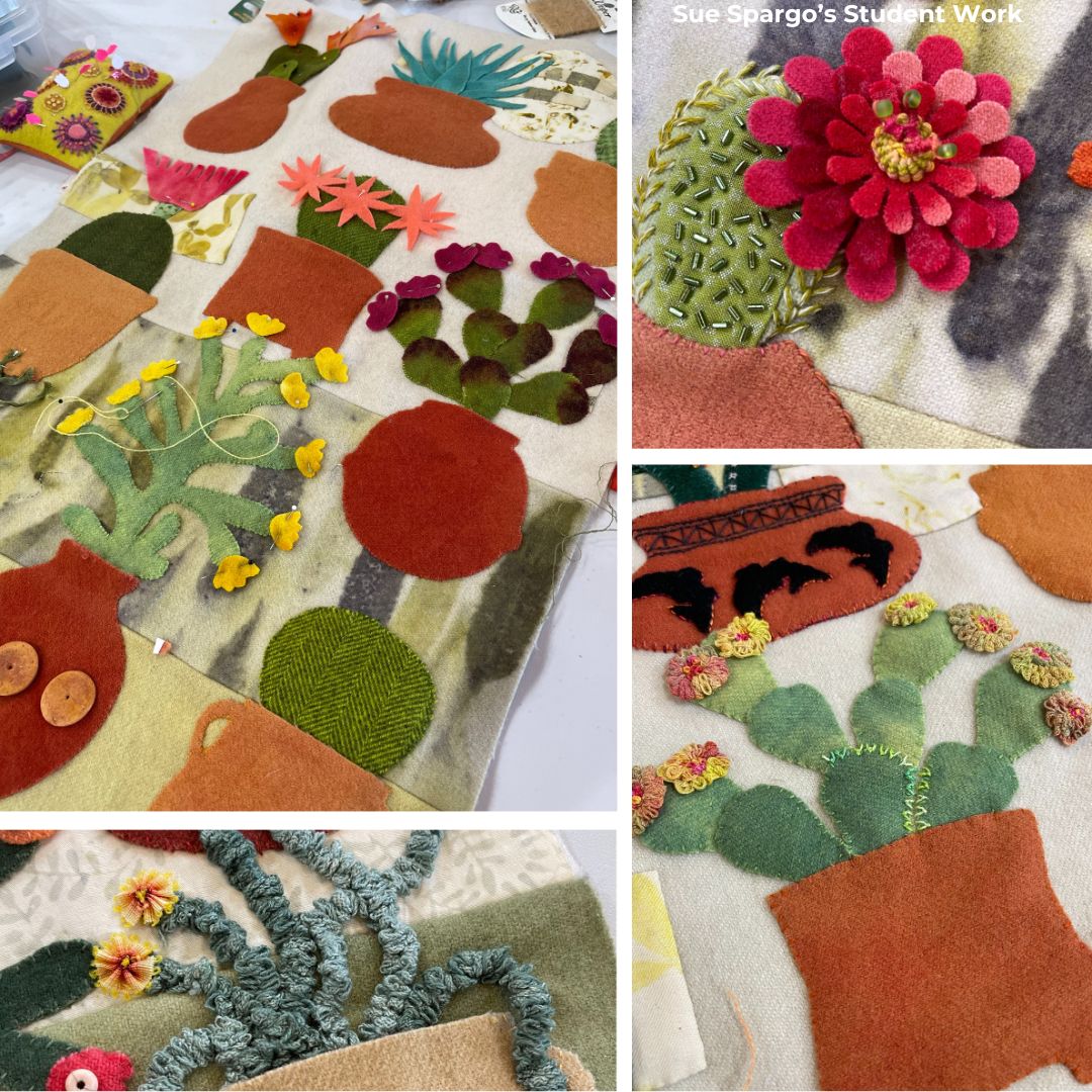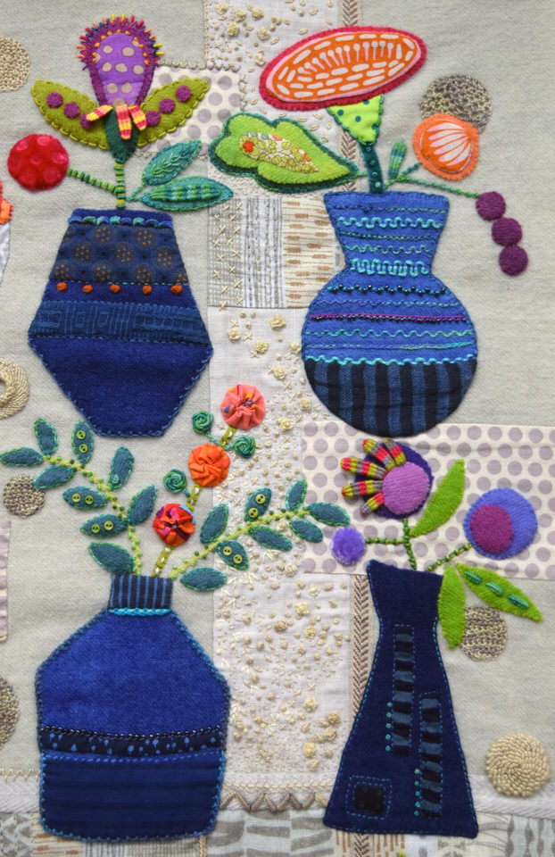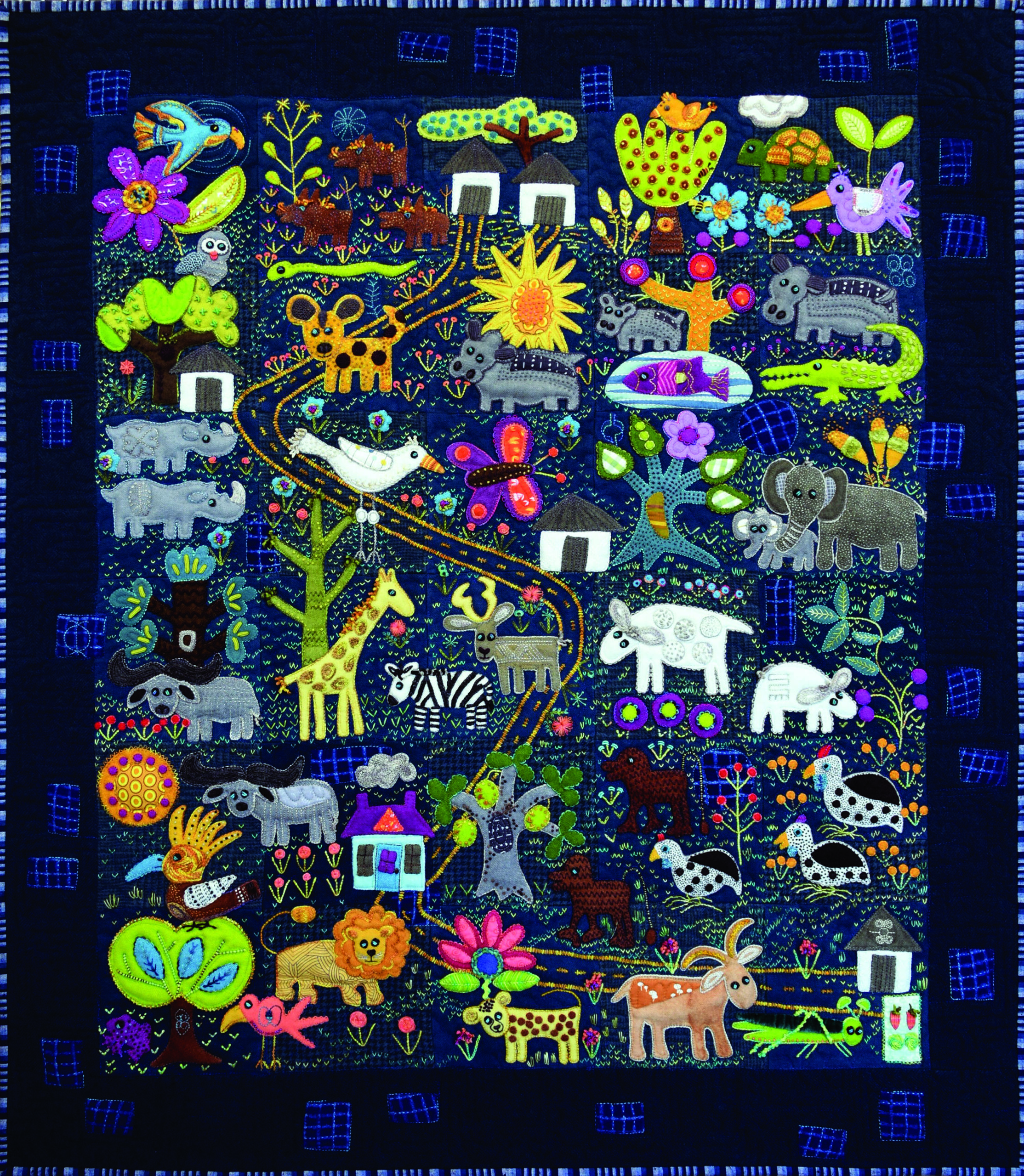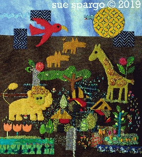 Sue Spargo was born in Zambia, educated in South Africa, and later lived in England. The stark contrasts between the arid beige-browns of the African bushveld and the lush greens of the rolling hills of Southern England inspired many of her designs and continue to be a rich source of ideas. The energy and color of traditional African designs stirred her love of “primitive” arts and crafts, and grew into her focus on folk-art. In 1989 she moved to the United States, and has lived in Connecticut, Tennessee, Utah and Ohio. Each new State presented sharp contrasts and stirred new ideas.