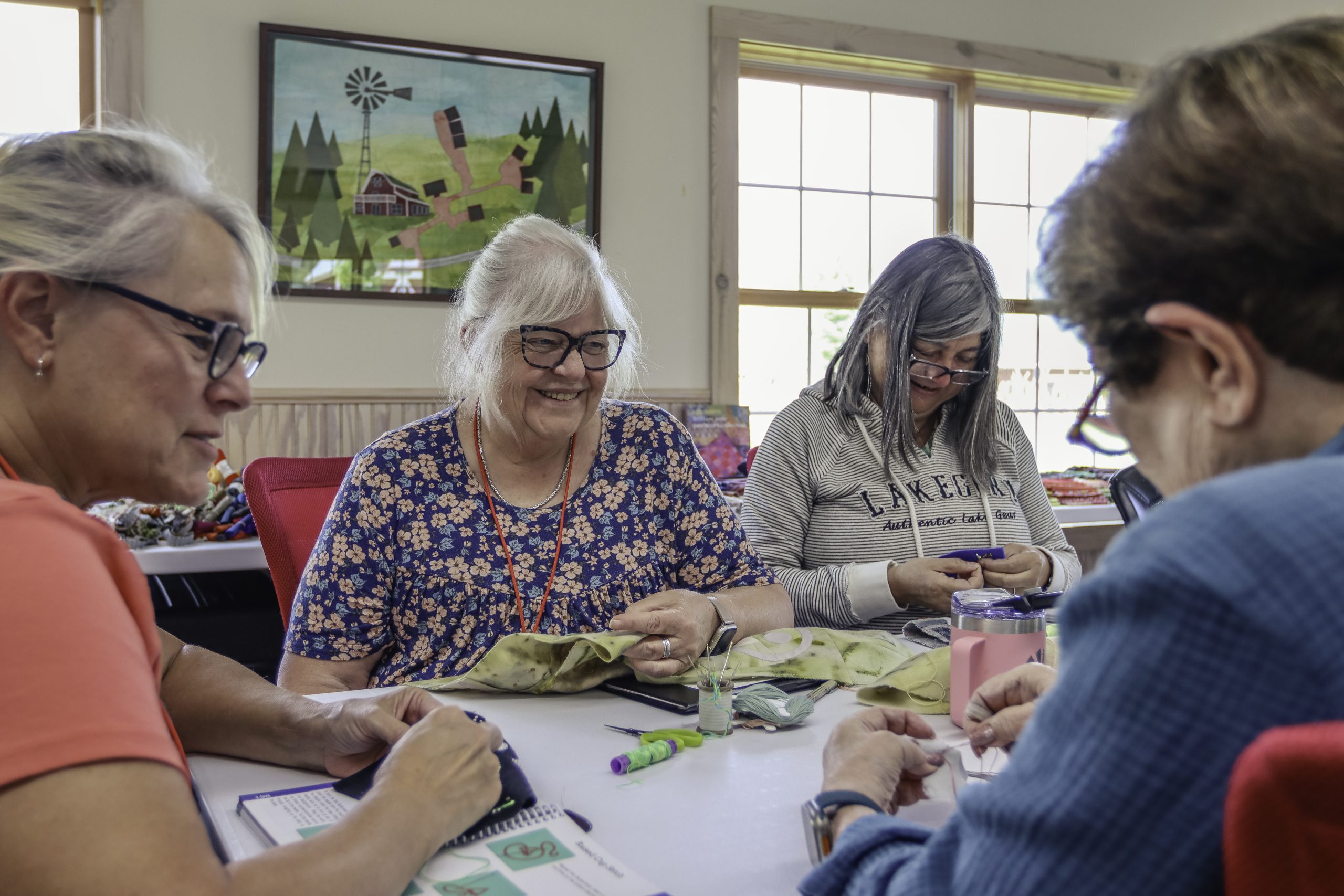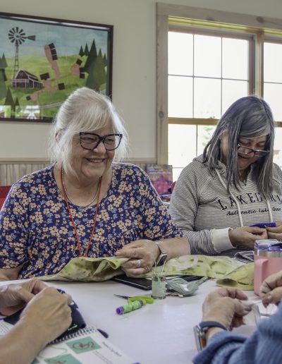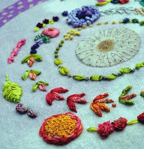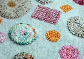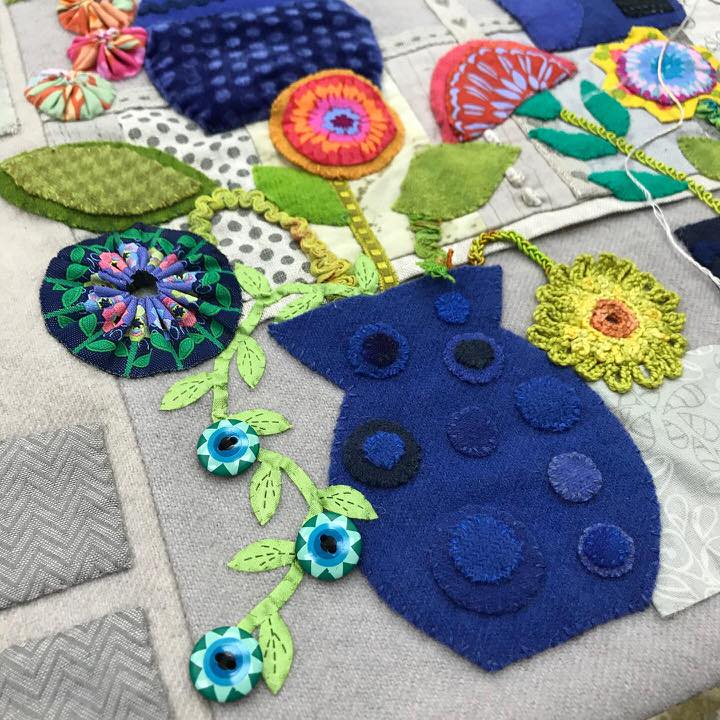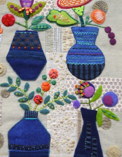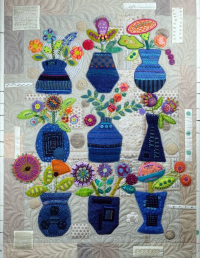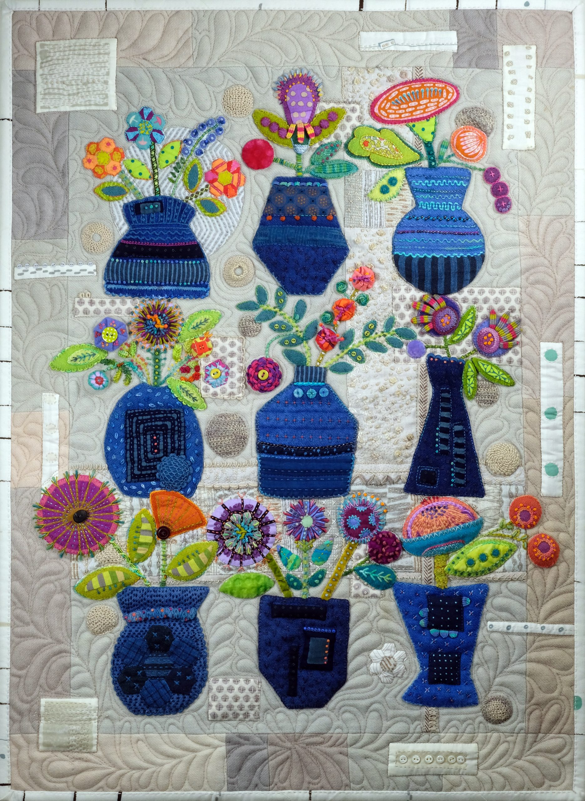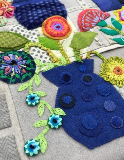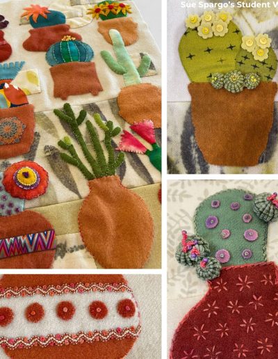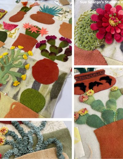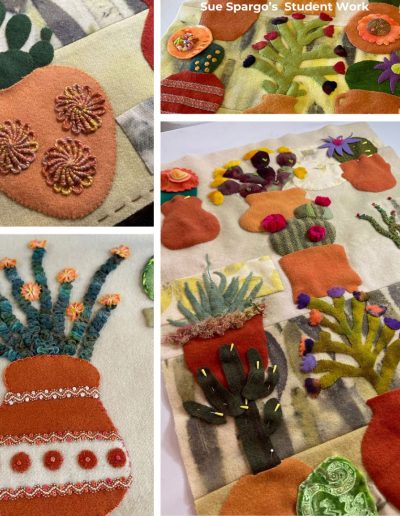 Sue designs quilted items using textural fabrics and embellishments. She creates and sells books, patterns and CD’s for these designs, and produces hand-dyed wool and wool plaids designed specifically for quilt makers.