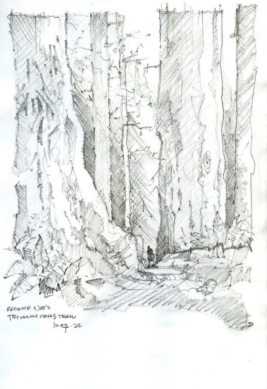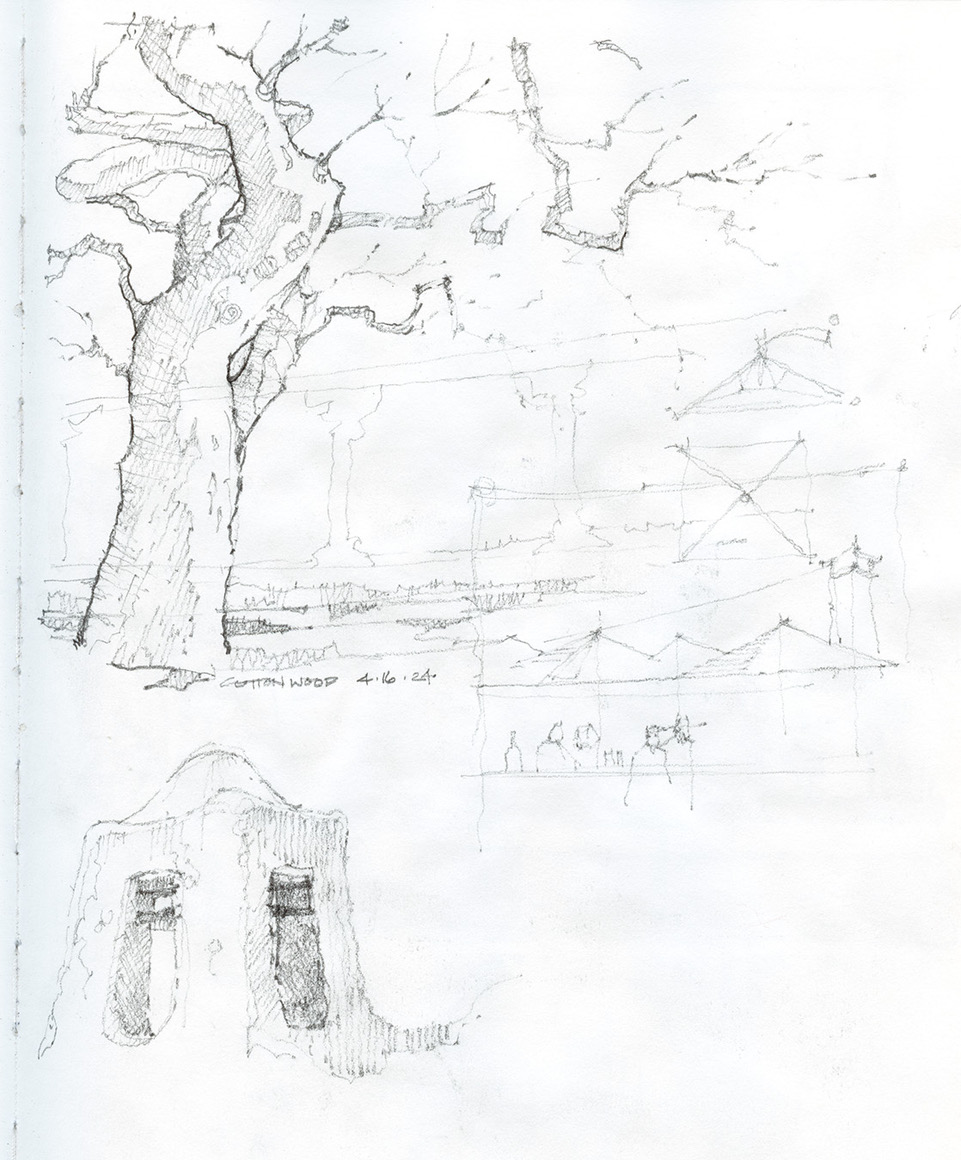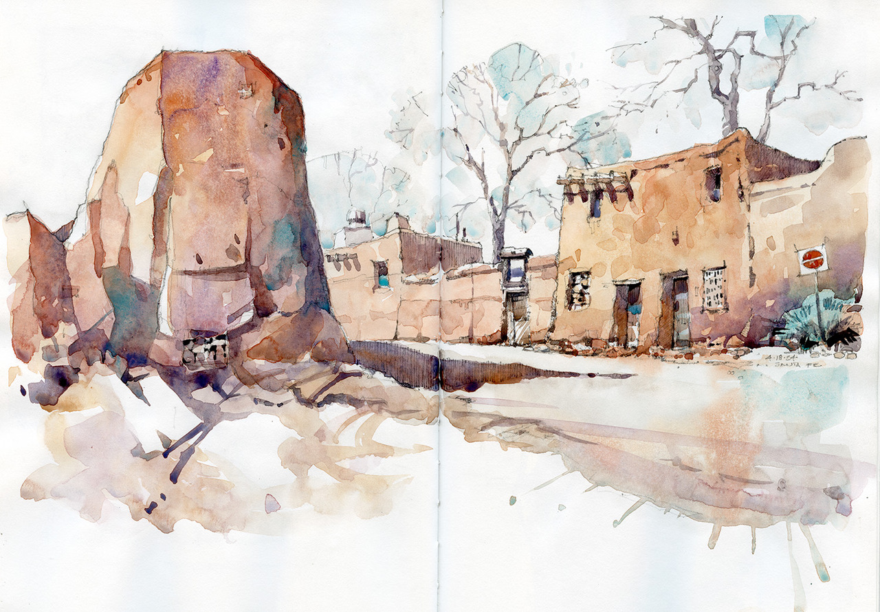 Sketching is a very personal endeavor. So much so that I’ve found it can be utilized to explore your surroundings without the constant buzzing in your head of “am I getting this right?” Of course we would all like to be able to put what we see in our minds eye down on paper but first we must begin to process how we see and sort through the types of work we want to do. For me watercolor and a nice blunt pencil typically do the trick but every one is different and I always encourage you to bring your skillset to the table. I have been drawing from life since 1989 when I first began architecture school and from the moment of that first foray I have been hooked on not only the exercise in trying to capture what I see but more importantly what it means to me. How I perceive it. There is a chasm of difference between accuracy and perception and somewhere in that middle ground is where I like to live my life as a recorder of my surroundings. Letting go of the idea of “getting things right” and embracing the idea of being part of something larger than yourself helps you to let go of many of the trappings I find many students struggle with. A sketch can be technically accurate but still have very little life in it. That spark of you is what transforms it and that is what I want to help you discover. Join me as we go deeper and without worry into the majestic west on a journey of what it means to be present in your surroundings.